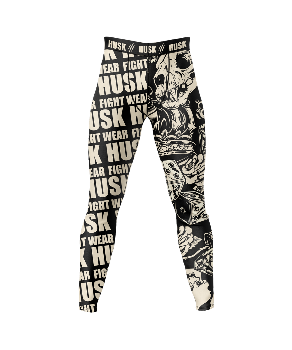 Beige and black compression pants featuring bold tattoo skull and dice graphics with 'HUSK Fight Wear' text