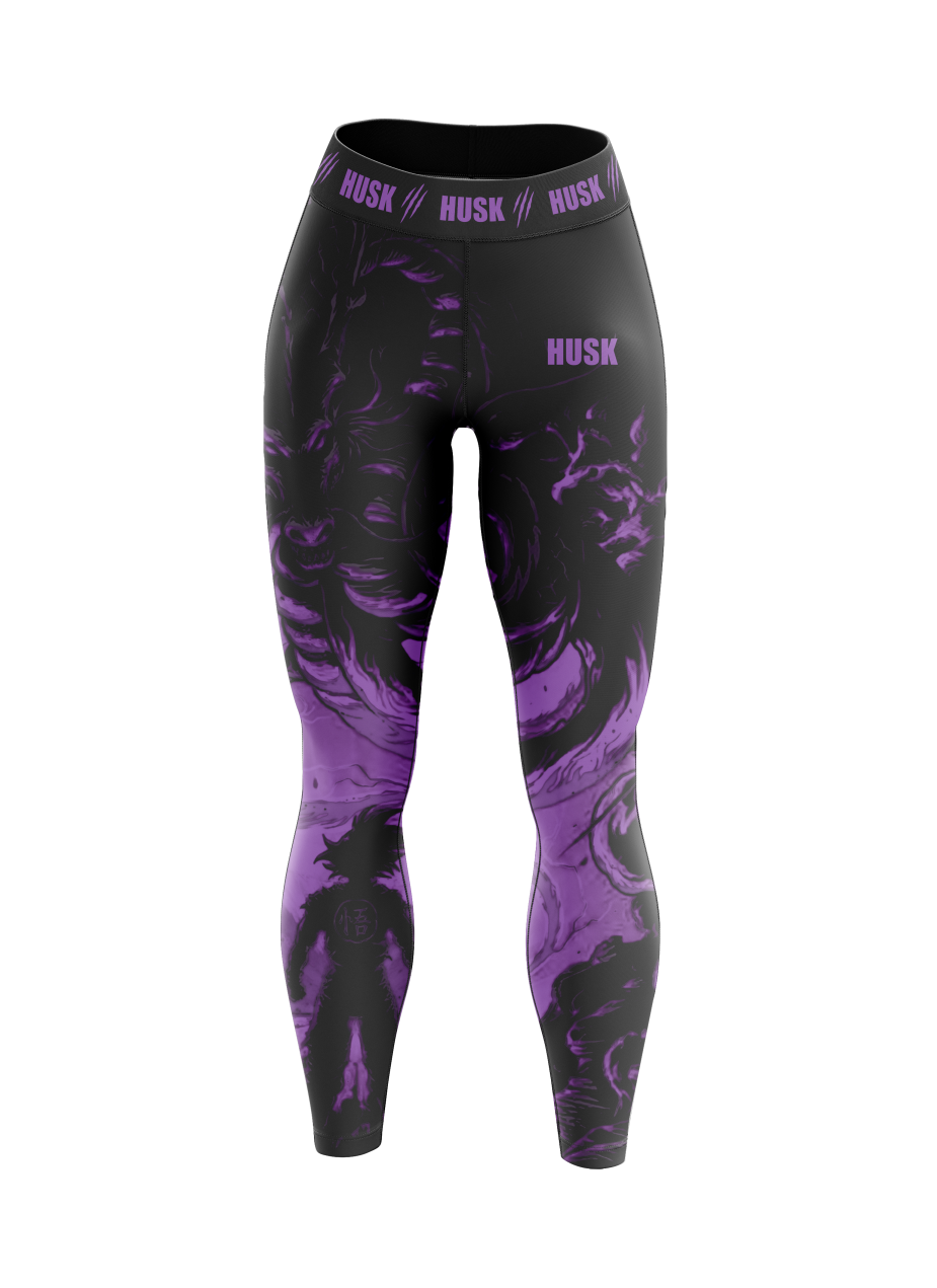 Enter the shadows with this dark and intense design. The swirling phantom-like artwork in electric purple and black makes these leggings a powerful choice for late-night workouts or gothic-styled fitness fits.