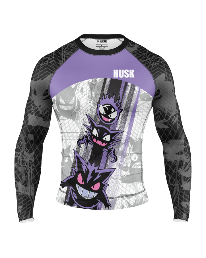 Unleash the power of mischief with this edgy rash guard featuring a ghostly gang of ghouls in black and purple tones. Perfect for grapplers with attitude.